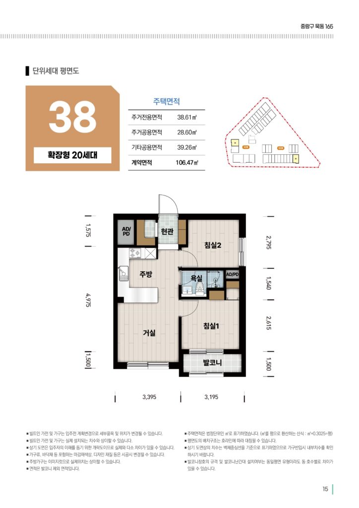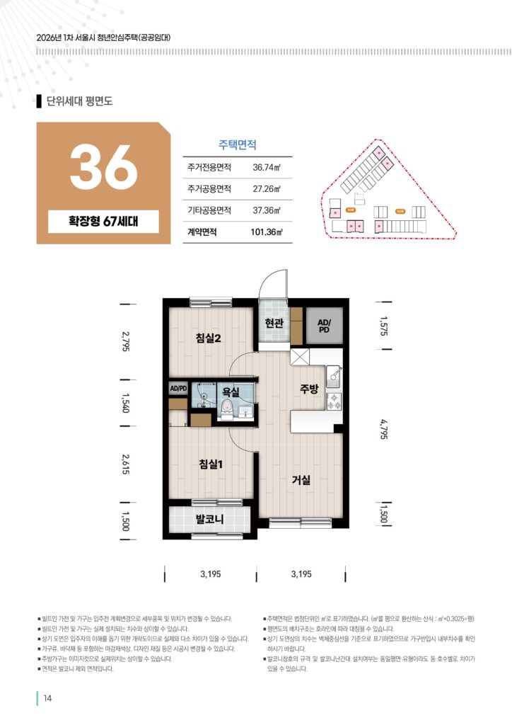 - 36 / 38형 (신혼부부 / 87세대): 침실 2개와 거실로 이루어진 2룸 구조(3베이 느낌)입니다. 신혼부부가 아이를 키우기에도 넉넉한 공간입니다. (에어컨 2대 기본 제공)