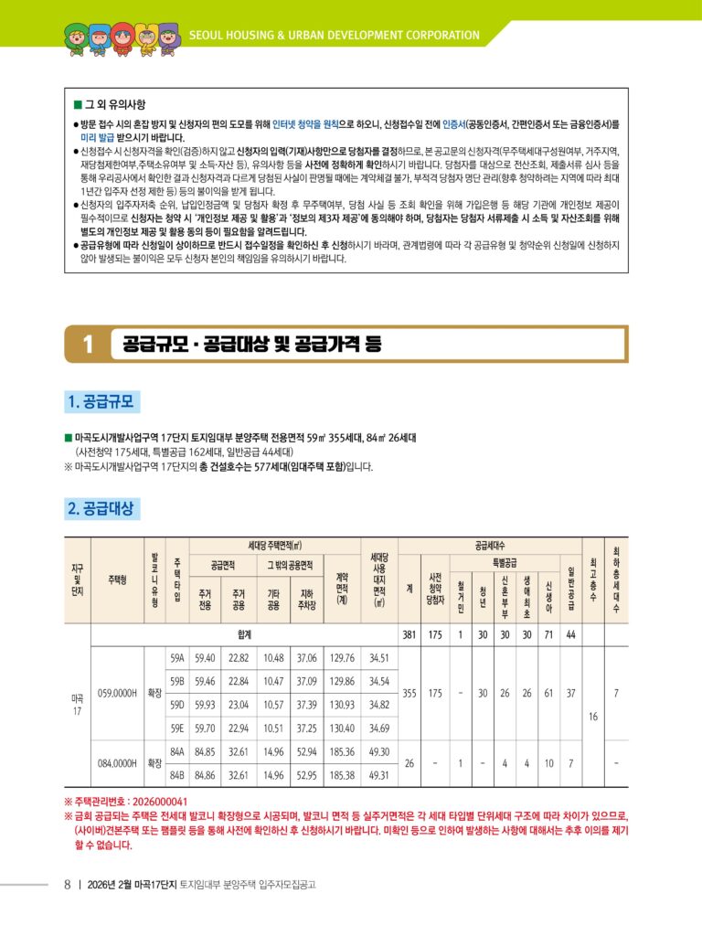 사업 주체는 서울주택도시공사(SH)이며, 총 577세대 중 이번 본청약 공급 대상은 전용면적 59㎡와 84㎡를 합쳐 총 381호입니다.