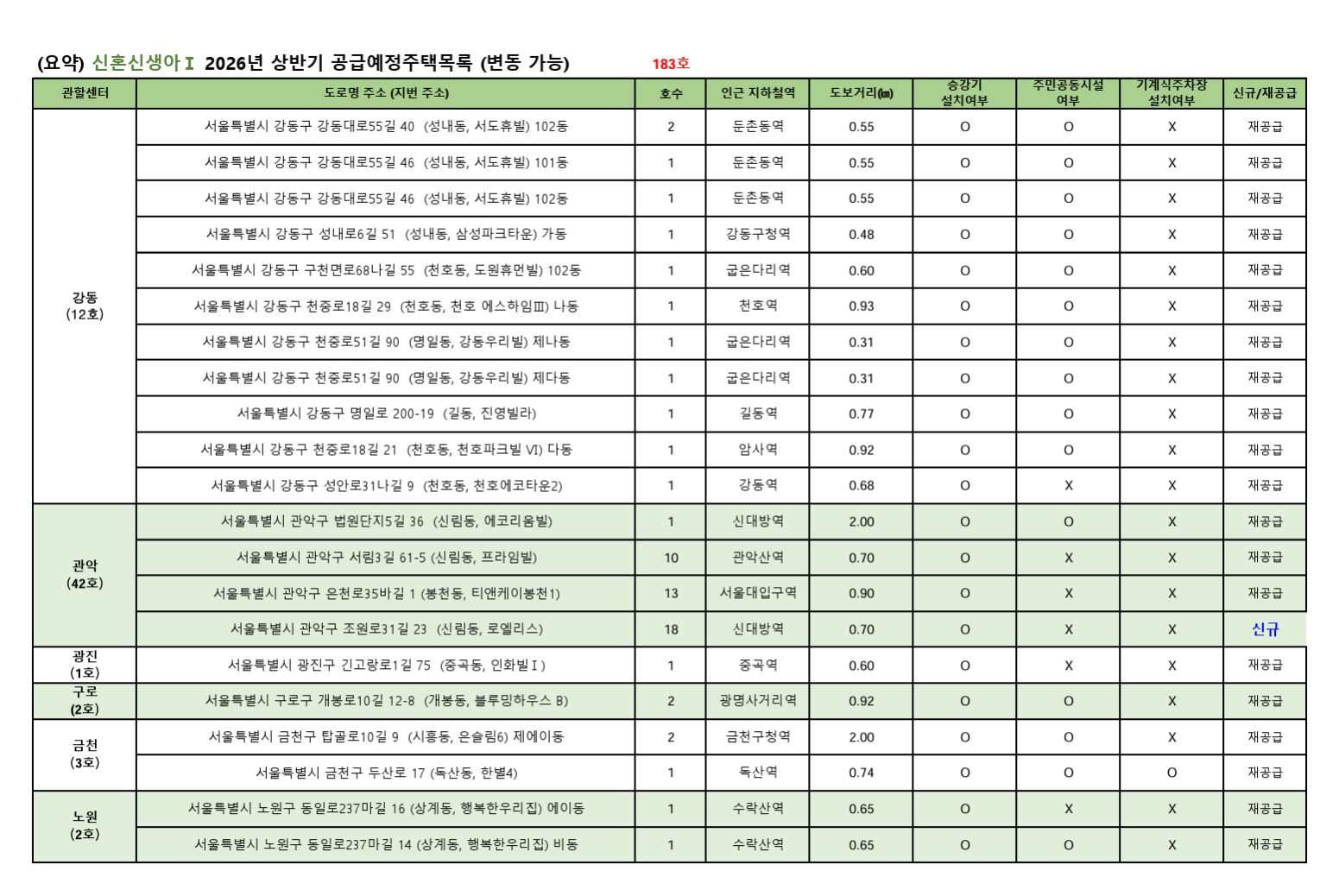 - 물량 집중 지역 파악: 전체 183호 중 관악구, 중랑구, 동대문구에 물량이 가장 많아 선택의 폭이 넓습니다.